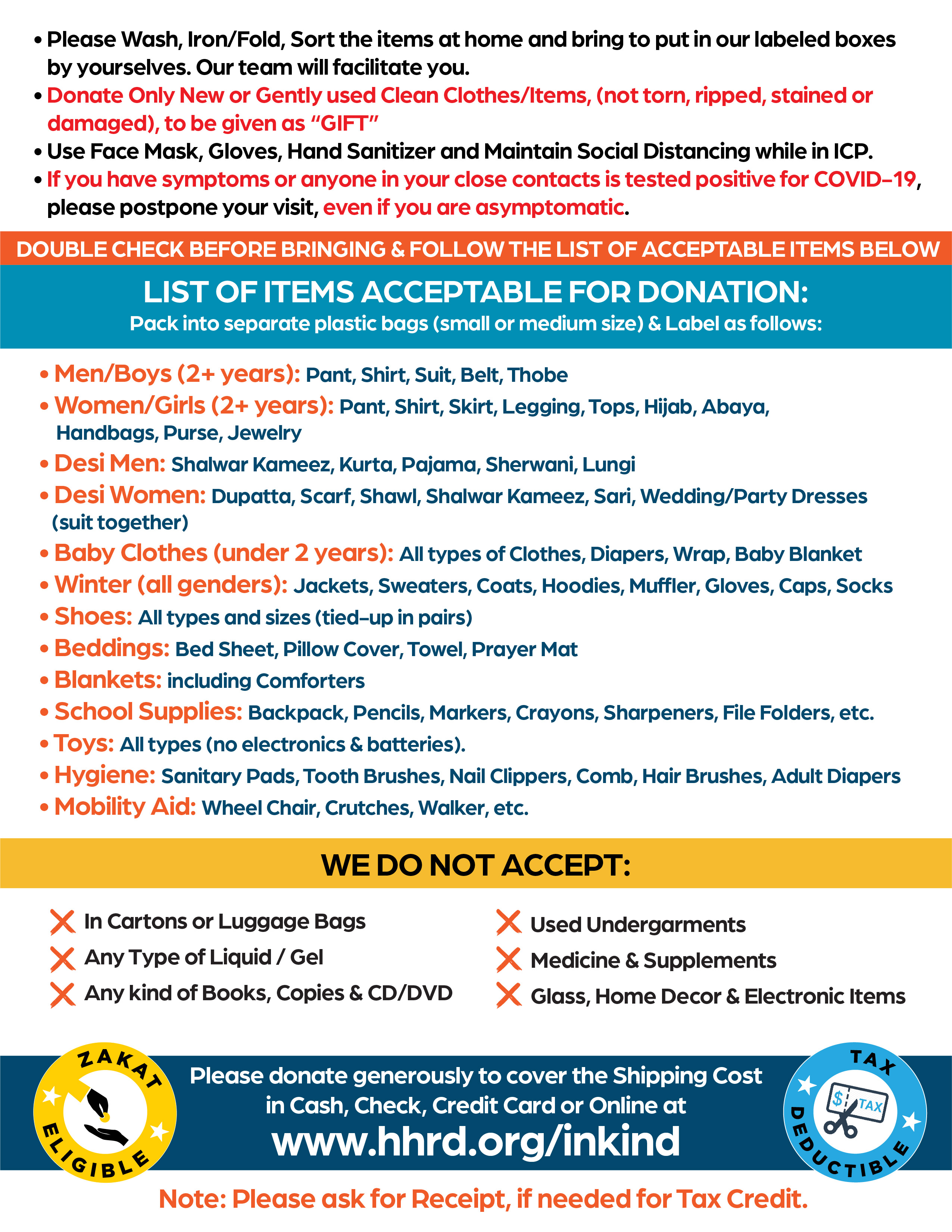 Please donate generously to cover the Shipping Cost in Cash, Check, Credit Card or Online at www.hhrd.org/Inkind-Gifts-Program